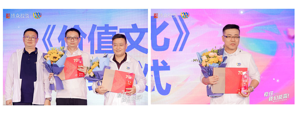 頒發(fā)博眾文化價值獎——個人獎。榮獲本屆“專注獎”的是來自博眾的劉冰老師、陳宗寶老師以及林杰老師。榮獲本屆“創(chuàng)新”獎的是陳細(xì)幫、張銘亮兩位博眾創(chuàng)新先鋒。最后一個獎項(xiàng)是“以客戶為中心”獎,獲得該項(xiàng)殊榮的,是來自博眾的孫文勝老師與劉開斌老師。均由廣東電視臺經(jīng)濟(jì)科教頻道副總經(jīng)理侯金龍先生為以上獲獎老師進(jìn)行頒獎并合影留念。